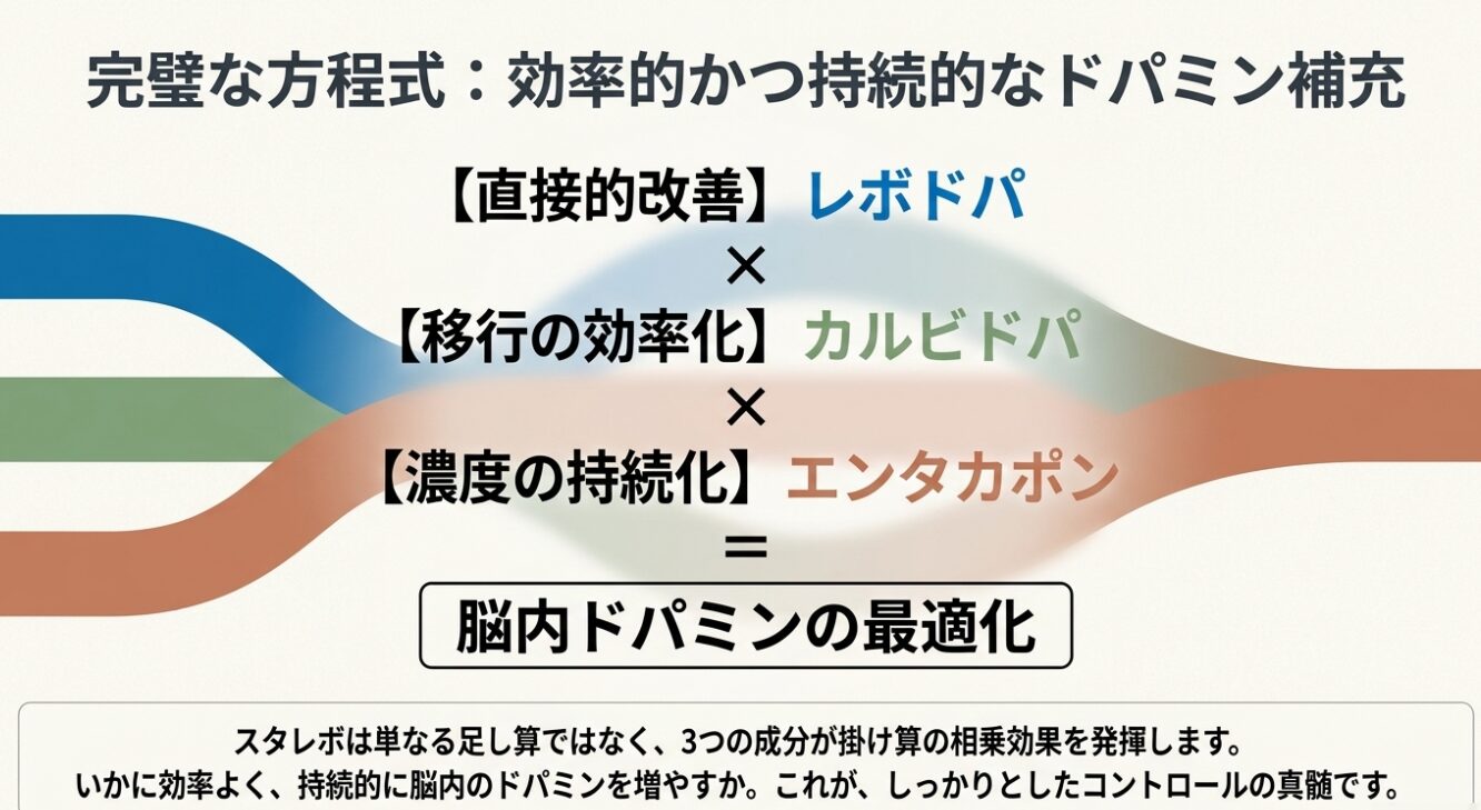 スタレボは、レボドパ・カルビドパ・エンタカポンの3成分が配合された強力な薬剤です。まずはそれぞれの役割を整理しておきましょう。